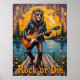 This vibrant artwork features a charismatic lion, sporting cool sunglasses and a leather jacket, passionately playing an electric guitar on a wooden dock. The dock extends into a calm blue lake, with a backdrop of lush pine trees and a soft, cloudy sky. The painting's thick, textured brushstrokes give a lively and expressive quality to the water and the lion, embodying the "Rock or Die" spirit.