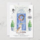 Announce your new address with our stylish announcement featuring a Lakeland Terrier, blue front door, welcome mat, slate sign, topiaries and a floral wreath set on a gray brick background.