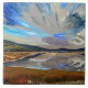 An art design of a lake with the dramatic sky reflected in the lake water. Hills and fields surround the lake.