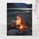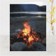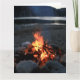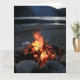 Photograph of an inviting-looking bonfire at a lakeside campsite