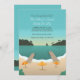 A scenic invitation that has a lake swimming area, beach umbrellas, docks, and a sailboat in the distance. Perfect for any lakeside celebration.