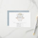 Whimsical lakeside themed wedding monogrammed laurel crest rsvp card in muted hues of dusty blue and sage green.