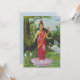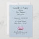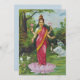 5” x 7” pearl shimmer invitation with an image of the Hindu Goddess Lakshmi dressed in pink and gold and standing in a pink lotus. There is a waterfall behind her and in the river there are swans and a white elephant with an upturned trunk adorned with a lei of flowers. The back is light blue and has an optional pink lotus and customizable party details.
