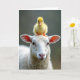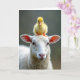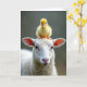 This design shows a close-up portrait of a young lamb with creamy white wool looking straight ahead with calm, dark eyes, while a tiny yellow duckling rests on top like a close companion 🐇. The duckling’s soft fluff stands out against a softly blurred background of muted greens and grays, keeping all attention on their quiet connection. Gentle, diffused light brings out the lamb’s springy fleece and the duckling’s small pink beak, as if they’ve paused together in a tender, trusting moment. The duckling’s bright orange feet lightly grip the wool, and the lamb’s relaxed posture makes the perch look safe and welcome. A short Easter greeting appears near the top in a soft pastel tone, with a smaller line of text centered near the bottom in a deeper contrasting color 🌷. The lamb’s ears show a translucent pink inside that echoes the duckling’s beak and adds a warm touch to the pale coat. The background stays smooth and out of focus, with the pair sharply detailed in the center of the frame.