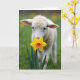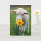 This design shows a young cream-colored lamb leaning forward in a green meadow scene, its dark eyes fixed on a bright yellow, trumpet-shaped flower 🌷. Soft, diffused light brings out the fluffy texture of the lamb’s coat and the gentle pink inside its ears, while the background stays softly blurred with hints of other golden blooms. The lamb’s close, careful posture toward the flower feels like a sweet, almost romantic moment of attention, as if it’s leaning in the way close friends do when sharing a quiet secret 🐇. The main flower in the foreground glows with yellow petals and a deeper orange-gold center, standing out against the green surroundings. Across the upper portion, a short Easter greeting sits centered in a light-colored font, and a smaller line of text rests near the bottom in a soft pastel shade. The spacing leaves plenty of open area around the lamb and flower so the scene feels calm and uncluttered. The lamb’s nose is nearly touching the flower’s central cup, with the petals angled slightly toward the lower right.