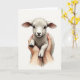 This card shows a small fluffy lamb centered in the design, cradled gently in two human hands as if in a quiet moment of friendship and care 🌷. The lamb’s large dark eyes and soft, curious gaze meet the viewer, while the hands cup its body with a tender, protective touch. Its white fleece is drawn with fine, soft texture against a plain white background that keeps all attention on the closeness between animal and caretaker. Soft, even lighting highlights the contrast between the lamb’s wool and the smooth, lightly rosy skin of the hands. A simple Easter greeting sits near the top in light gray lettering, with a smaller line beneath it in pale pink, leaving plenty of open space around the illustration 🐇. Subtle details like neatly trimmed nails and the gentle curve of the fingers add to the sense of careful handling without needing extra decoration. The lamb’s ears show a warm blush of pink, and its tiny dark hooves rest securely in the palms.