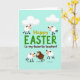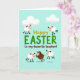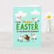 This design shows a pale teal background with a cheerful Easter greeting centered on the front, surrounded by five fluffy, lamb-like animals with dot eyes and soft smiles that seem to gather close like friends. The word “Happy” sits at the top in gold lettering, “EASTER” appears just below in green, and “to my favorite teacher!” is placed underneath in brown. Four of the little animals are white and spaced around the text as if they’re gently circling it, their rounded bodies and tiny legs giving a light, springtime feel. A fifth animal in a warm brown shade rests near the lower center, adding contrast and looking like it’s cozied up protectively beneath the message. Two puffy cloud shapes float in the top corners, balancing the layout and keeping the scene airy and open. Small touches, like the animals leaning inward and smiling toward the words, add a tender, appreciative tone without needing extra decoration 🌷. The overall look is soft and simple, with the green “EASTER” standing out between the gold “Happy” above and the brown line of text below, while the brown animal anchors the bottom like a gentle focal point 🐰.