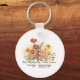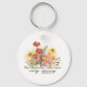 Keychain with inspirational quote scripture depicts a lovely flower garden art design with simple orange, pink and yellow flowers and green leaves, It features Bible Verse Lamentations 3:23, "His mercies are new every morning."