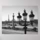 Black and white photo of a Parisian lamp post with the Eiffel Tower in the background.