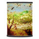 It was quick delivery, sooner than expected. This lampshade is exactly as described and the perfect size for my lamp. I replaced the old bell shape lampshade with this barrel shape and it allows me to place my lamp closer to the wall. I love the soft colors of this lamp shade and the modern-southwest design. In the evening, the light is a cream color. I am very happy with this lampshade and highly recommend this product. (Pardon the quality of my photos for this review.)