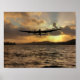 An RAF Lancaster bomber flying low over the water as the sun sets