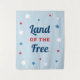 Celebrate freedom with this Land of the Free tapestry featuring elegant script lettering and scattered red, white, and blue stars on a light blue background. A beautiful Fourth of July party photo backdrop, patriotic wall hanging, or Independence Day event decoration. All text is fully customizable.