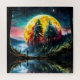 Large Colorful Moon Sets Down in the forest as a girl watches across a valley