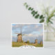 Photo postcard of three windmills and sheep looking into the camera under beautiful clouds in the sky in a lovely spring landscape in the countryside in the Netherlands with a white edge and the text 'Netherlands'.