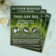 Bold flyer template for landscapers, lawn care professionals or gardeners. Features a green grass photo background, editable text areas and service icons for lawn mowing, leaf cleanup and hedge trimming. Includes space at the bottom for a longer description of services. Perfect for promoting local yard work with clear contact info and a clean, eye-catching layout.