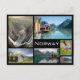 Postcard of various landscapes with fjords, lakes and waterfalls in Norway in a collage with a black frame and the text: 'Norway'.