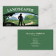 Garden designers, landscape architects, professional gardeners, horticulturist, mowing and lawn care, tree pruning, arborist, and maintaining green spaces are some of the people who use this business card. The design is made up of a silhouette of a man with a hat holding a shovel, standing in front of a lush green landscape with trees, flowers, and a pathway.