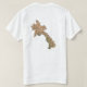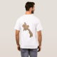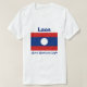 An editable title and slogan accompanies the white circle centered over a blue band with red bands above and below of the Lao flag on the front of this t-shirt. The back displays a detailed map of Laos.