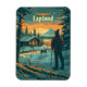 A serene and nostalgic depiction of Lapland, Finland, showcasing its pristine Arctic wilderness, snowy landscapes, and unique cultural heritage. The design features the region's iconic reindeer herds, Northern Lights dancing in the night sky, and cozy log cabins surrounded by snow-covered forests, all illustrated in a vintage style. This artwork captures the serene beauty and adventurous spirit of Lapland, inviting viewers to experience its magical atmosphere and Arctic wonders.