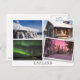 Postcard with a collage of four landscapes in Lapland in the snow in winter like northern lights, a snow forest, skis and a log cabin with photos with a white edge and one twisted like it is loose and with the text: 'Lapland'. It is a great vacation souvenir.