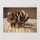 This postcard features a very simple still life composition of a single golden brown larch cone still attached to its branch on a straw mat against a chocolate brown background. The exquisite detail of this very small cone resembles a wooden rose. Lovely for Christmas and the holiday season.