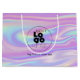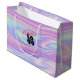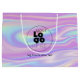 Available in matte or glossy finish, promotional gift bags custom branded with your business logo add a professional touch to your corporate gifts, giveaways, and retail shopping bags while advertising your business. Made by Digiwrap. No minimum order quantity and no setup fee. This bag is set on a pastel iridescent faux holographic rainbow liquid swirl print background, ready for your logo graphic.