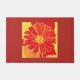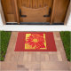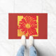Doormat in a retro modern graphic image of a large daisy aster flower, in vivid red and golden yellow, against a red and saffron yellow background, and bordered in deep red