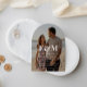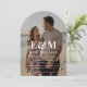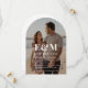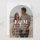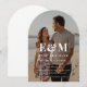 Arch-shaped save the date wedding announcement featuring your photo overlayed with your monogram initials in large elegant white serif typography. Customize your save the date details in modern white lettering.