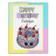 Cute hand drawn personalized whimsical pink birthday cake Kawaii style with a pop art background. This card has feminine colors so would be cute for a child, daughter, mom, Aunt or sister.