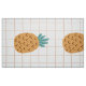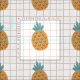 Cartoon illustration of pineapples and a light brown and white grid in the background decorate this fun pineapple upholstery fabric. The print is large and suitable for use in various home decor, art, and crafts projects.
