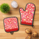 A festive poinsettia holiday pattern pot holder and oven mitt with large red and dark pink flowers and deep red borders.