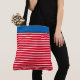 This tote bag is shown with a fun Red and White striped print design with a Marine Blue color top panel. Large size shown. Has Black straps.