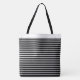 This tote bag is shown with a fun Black and white striped print design. Large size shown. Has Black straps.