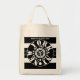 Grocery Tote natural with black front with black and white concentric-circles design with Y-NOT-ME logo in the middle surrounded by "GO AHEAD YOU CAN DO IT" which is surrounded by "CENTER OF THE UNIVERSE" which is surrounded by "NEW YOURK, NY" with "KEEP NYC-PLASTIC FREE" at the top. This design is a shout-out to New York City, New York, a world leader.