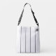 Crossbody Bag white with black pinstripes and "THE BIG TOWN #NYCCOU NEWYORK CITY-CENTER OF THE UNIVERSE NEW YORK-THE EMPIRE STATAE THE BROOKLYN BRIDGE OPENED MAY 24, 1883" with Y-NOT-ME logo on the back. The massive and iconic Brooklyn Bridge is recognized worldwide.