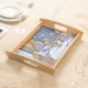 This is a well made, sturdy wooden tray with a flawless black finish and lovely map on the tray surface. It is both vintage & modern at the same time. Looks exactly like the photo; does not disappoint. So nice to find something of quality individually made and not the mass-produced 'shabby chic' merchandise seen in stores. I am so pleased to be able to give this to my college-age niece for her birthday. This can be used as a tray to hold jewelry or toiletries, or hung on the wall as art. The map surface is sealed (it is slightly shiny) so would be moisture resistant. It is well worth the asking price but I was able to apply a sale code as well. Very happy with my purchase. Map is crisp & clear and sealed with a water-resitant finish.