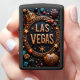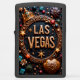 This ornate lighter features the metallic 3D text "LAS VEGAS" within a highly detailed circular gold frame. The background is covered with festive casino-themed elements like stars, spheres, and a small golden castle structure. The entire design has a rich, textured, celebratory feel, capturing the spirit of the city's nightlife. The artwork is printed on a matte black lighter case. The design may look real due to the high detail and three-dimensional texture in the artwork.