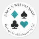 Faux teal glitter and black card suits are circled by customizable text making these round stickers perfect for all kinds of projects and occasions. Use them to label favors for wedding guests, to close envelopes and more.