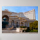 This striking view of Monte Carlo in Las Vegas includes sunlight glinting off a fountain in front, shadows crossing the great building facade, and greenery basking in the warm afternoon glow.