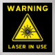 Yellow and black laser warning symbol poster with "Warning - Laser In Use" text.