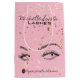 This bag represents a fusion of functionality and style, it’s a fully customizable product for the savvy online beauty shop offering top-tier lash extension products. Simple black, gold glitter and pink design with a personalizable script, it serves as an elegant bag for products like lash extension aftercare kit, lash cleansers, and other lash bath accessories vital for the upkeep of eyelash extensions. Black and white illustration of woman eyes with long eyelashes is set against a blush pink watercolor brush stroke, invoking a sense of feminine charm and artistic flair.