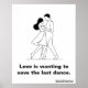 This elegant and minimalist art print by Michael Carter, Save the Last Dance, captures a timeless moment of love and connection. The illustration shows a couple dancing together, symbolizing the joy of shared moments and the promise to always hold each other close. With the romantic phrase "Love is wanting to save the last dance," this piece speaks to the commitment and affection that defines a lasting relationship.