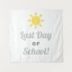 Celebrate the end of the school year with this cheerful Last Day of School tapestry featuring a bright yellow sun graphic and playful gray script lettering on a white background. Perfect as a classroom photo backdrop, last day of school party sign, or end of year celebration decoration. All text is fully customizable.