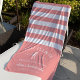 Celebrate your bachelorette weekend, getaway or party with these unique custom beach towels. Personalized design features vibrant flamingo pink and white stripes with "last fling before the ring" flanking a pair of white palm trees. Personalize with the bride's name, year and destination.