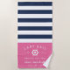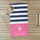 Celebrate your bachelorette weekend, getaway or party with these unique custom beach towels. Personalized design features nautical navy blue and white stripes with "last sail before the veil" flanking a white ship's wheel illustration on a candy pink background. Personalize with the bride's name, year and destination.