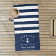 Celebrate your bachelorette weekend, getaway or party with these unique custom beach towels. Personalized design features nautical navy blue and white stripes with "last sail before the veil" flanking a white nautical anchor illustration. Personalize with the bride's name, year and destination.