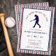 Celebrate the groom's final inning as a single man with this "Last Swing Before the Ring" baseball-themed bachelor party invitation. Featuring a classic navy blue silhouette of a batter against a rustic white wood-grain background, this design is framed by a sporty red and navy chevron stitch border—reminiscent of the seams on a baseball. Perfect for a night out at the ballpark or a sports bar celebration, this template is fully customizable. Easily update the name, the date, time, and location to fit your specific event.