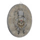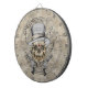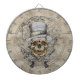 Cool skull art dartboard design features skull wearing hat with owl peeking from behind. Two crossed guns and super detail with swirls and text art. Text art says "Feeling Lucky?"