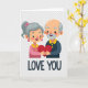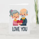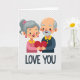 This card shows an elderly couple centered on a plain, light background, smiling with a calm, happy look. The woman has gray hair pulled into a neat ponytail with a pink bow, plus pink drop earrings and a bright pink top with a yellow collar. Next to her, the man has a gray beard and a bit of gray hair at his temples, and he wears a deep blue shirt with a yellow collar. Their hands meet in the middle as they hold one red heart together, making the love between them feel steady and shared ❤️. Under the picture, the words “LOVE YOU” appear in dark blue, thick uppercase letters near the bottom of the card. The simple shapes and smooth lines keep the focus on their faces and the heart, which makes the message easy to feel. It’s a meaningful card to give when you want to say you care in a sincere, lasting way 🥰. Hope it helps you share your Valentine’s Day sentiments.