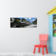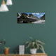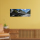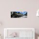 Poster print of the double Latefossen waterfall cascading under a bridge into a river in Norway in panorama format.